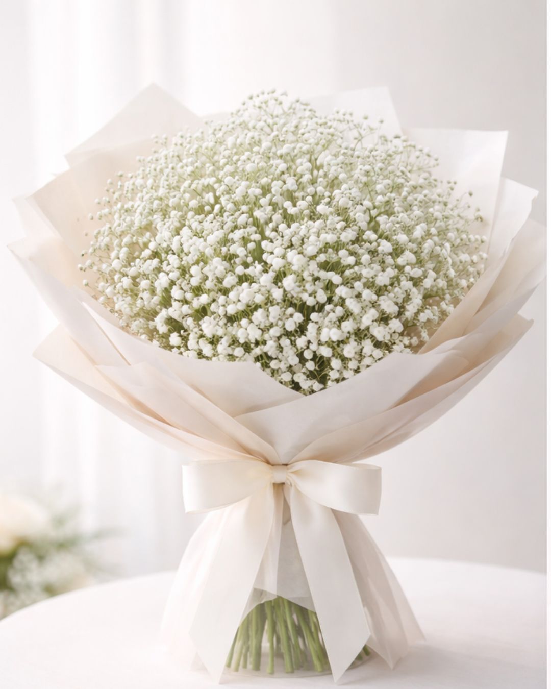 A beautifully simple and elegant bouquet that celebrates the natural charm of fresh baby’s breath. Designed in a modern style and carefully wrapped in premium paper with a delicate bow, this bouquet offers a clean, timeless look perfect for any occasion.